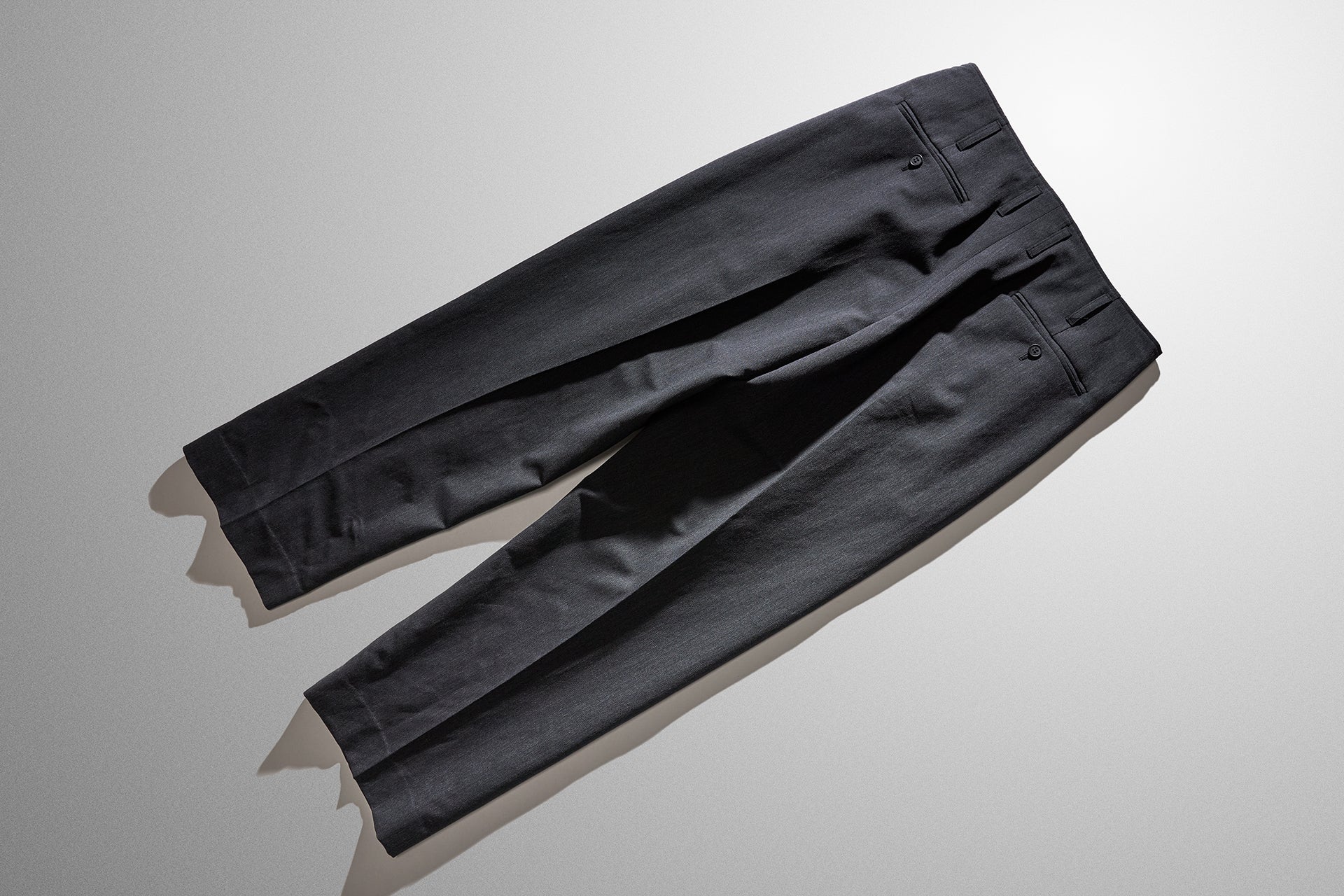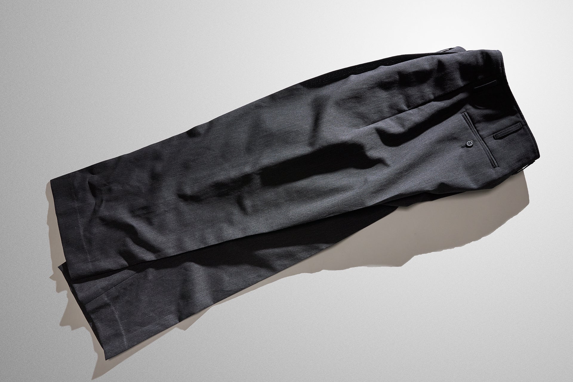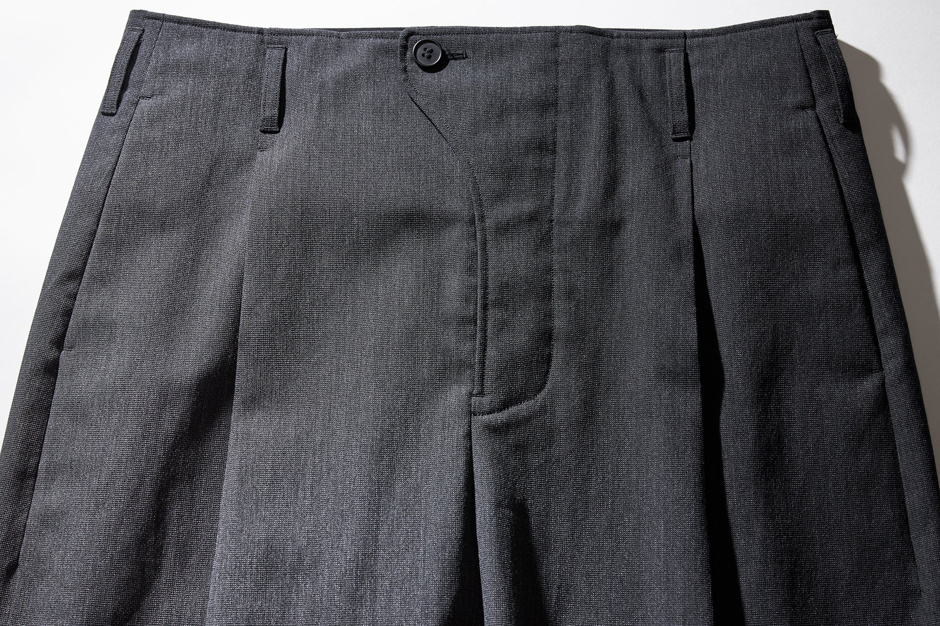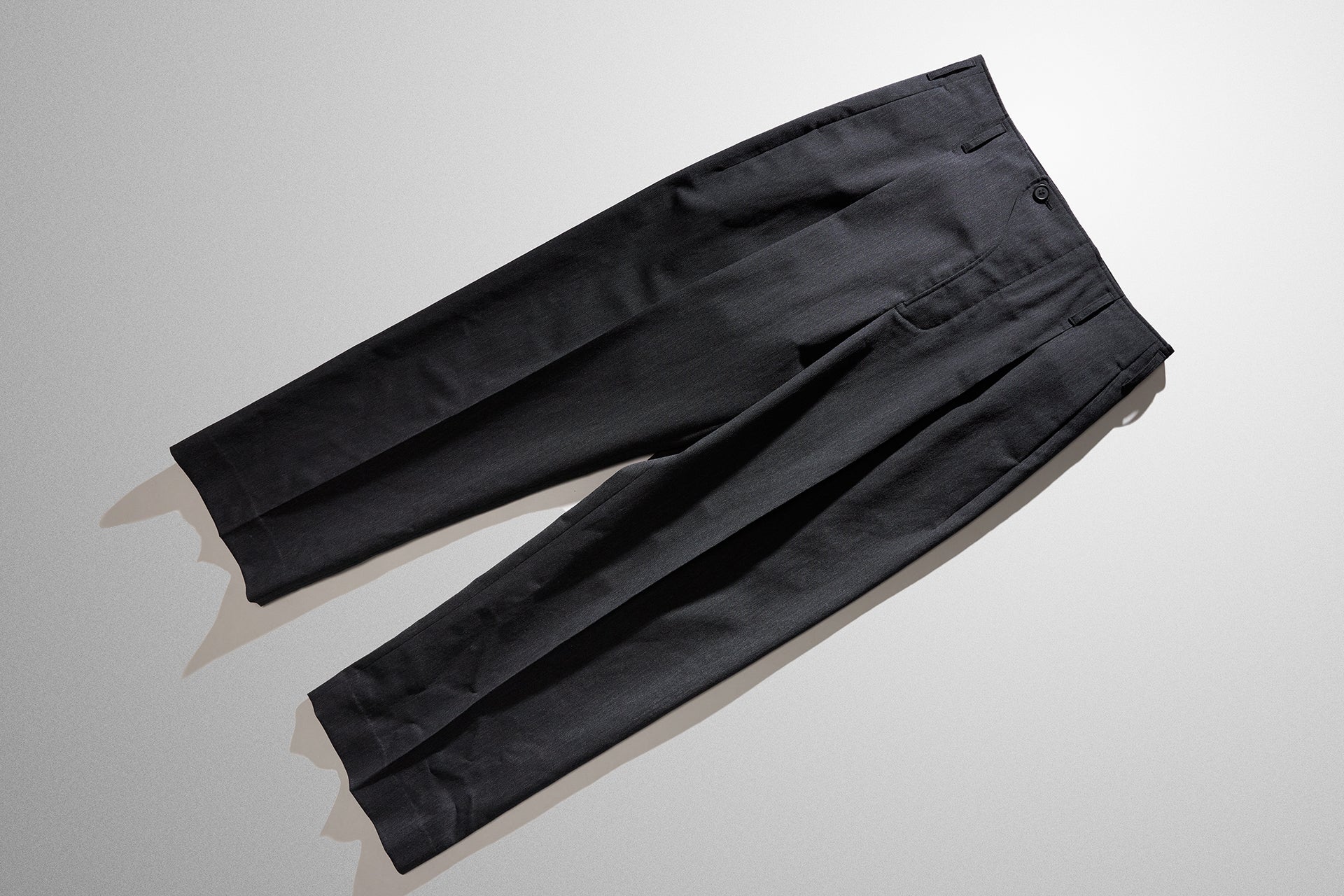 かなり太くとったタックとクリースの繋がりや、パターン上タテの地の目に合わずクリースが湾曲しているデザインが、ウールの美しい落ち感で、より一層シルエットを際立たせています。