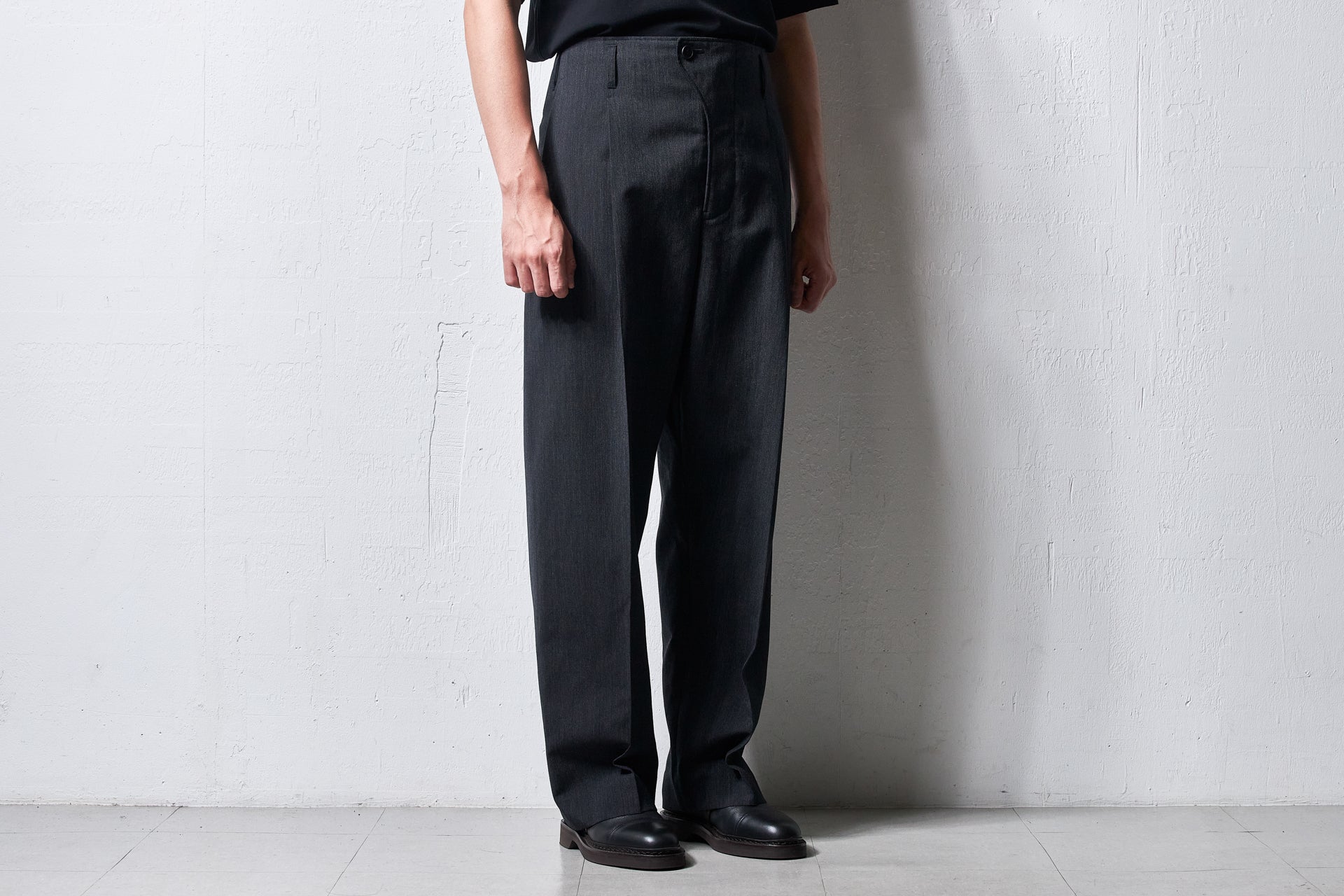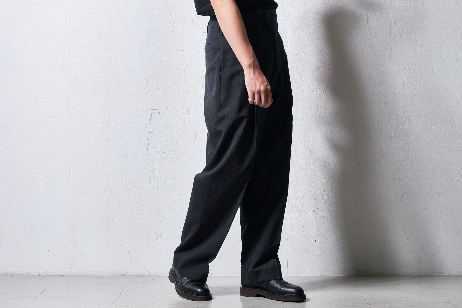 【入荷前】yc64-261-wa / ウール×和紙 ・サイドシームレスワンタックパンツ-charcoal black