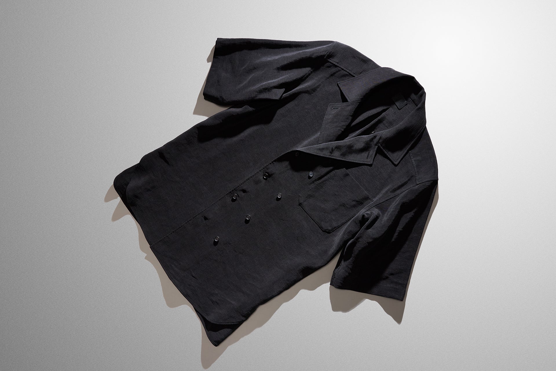前の重なりが広く、ダブルのジャケットのようなデザインで、止めるボタン位置により、様々な表情に変化します。